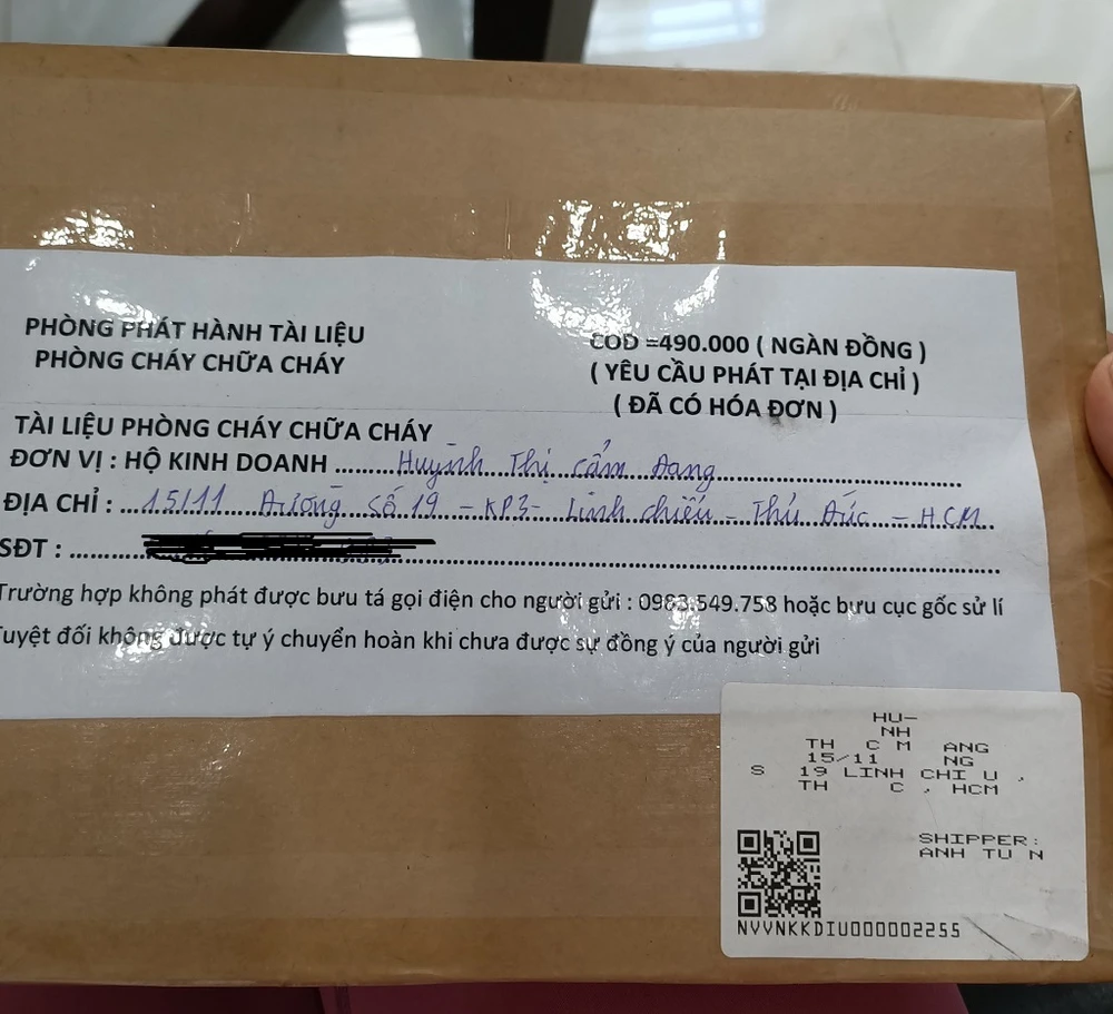 Tài liệu PCCC mà chị Đang nhận được không phải do cán bộ PCCC thật sự cung cấp mà là do người mạo danh gọi qua điện thoại. Ảnh: NVCC