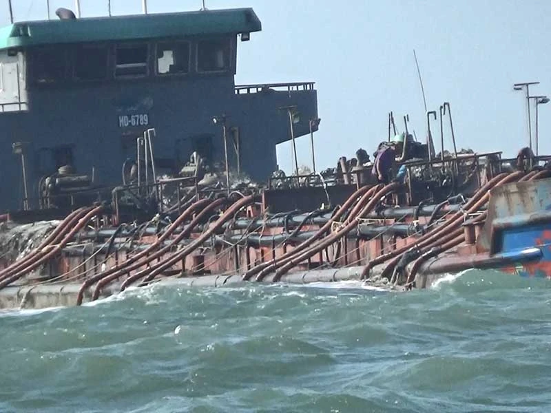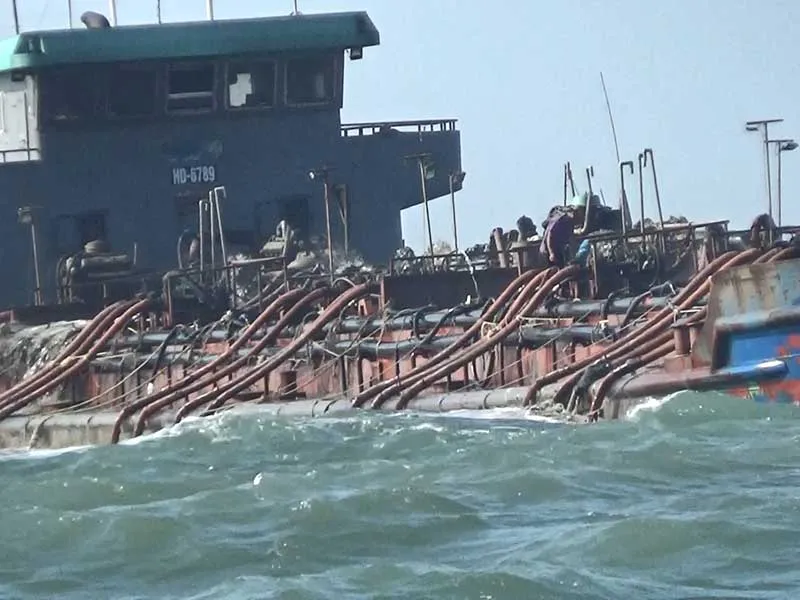 Tàu chúng tôi tiếp cận một sà lan lớn số hiệu HD-2455 đang hành nghề giữa biển. Hai bên mạn sà lan được đặt nhiều máy bơm nối kín với khoảng 24 vòi hút lớn. Mỗi vòi hút có đường kính lên đến 30 cm, thọc sâu xuống lòng biển để hút cát. Trên boong có một số người đứng máy, nước xả lênh láng từ mạn tàu xuống biển. Ngay sau nó là một sà lan khá cũ không có số hiệu cũng đang thả neo, đưa hàng chục vòi hút lớn xuống biển.