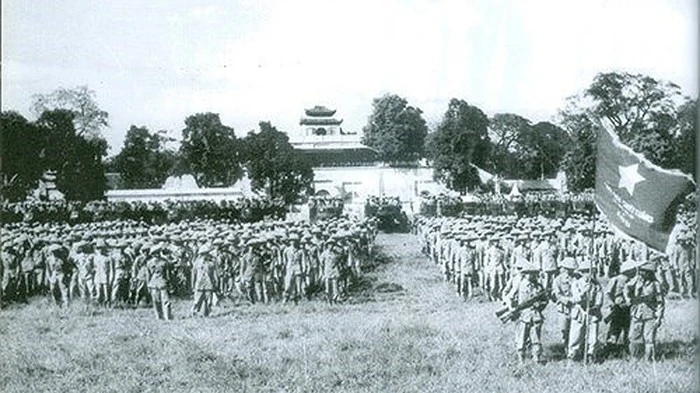 Lễ chào cờ tại sân Đoan Môn - Hoàng thành Thăng Long năm 1954. Ảnh tư liệu