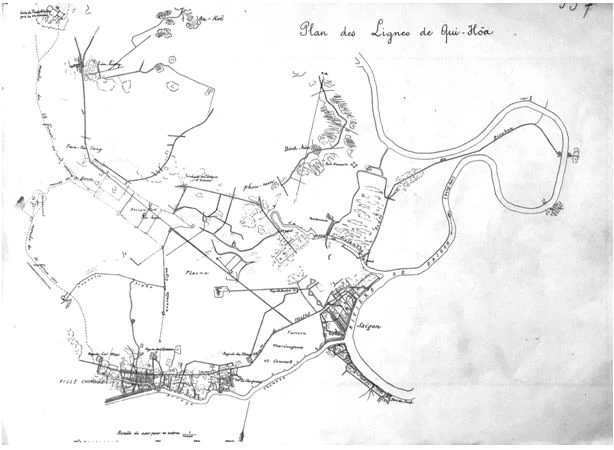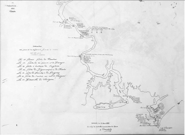 Bản đồ Sài Gòn 1861 về chiến tuyến Kỳ Hòa và phác đồ vị trí các đồn và các tàu Pháp ở Nam kỳ (tháng 11-1861).