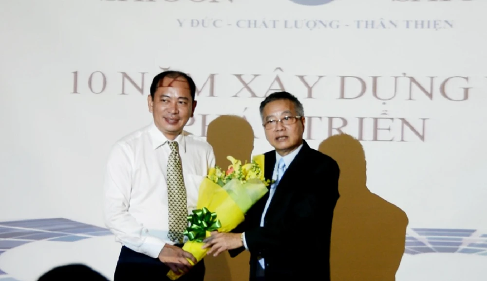 Phó giám đốc Sở Y tế TP.HCM tặng hoa chúc mừng BV Tai Mũi Họng Sài Gòn 10 năm thành lập.