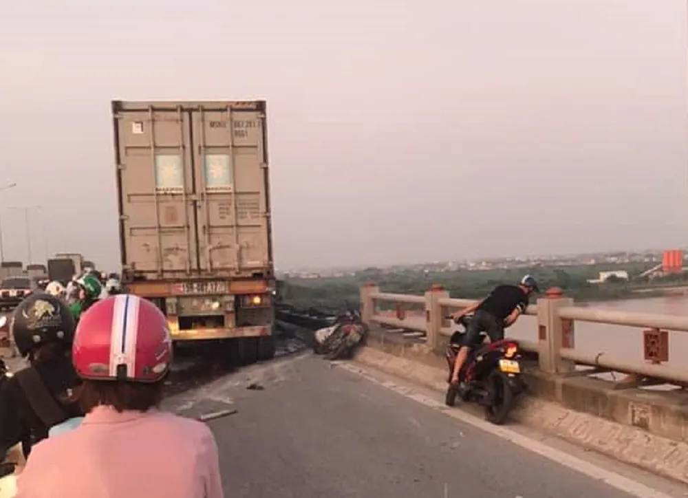 Thời điểm trên, chiếc container đi trên cầu Thanh Trì hướng về Long Biên bất ngờ mất lái, lao qua dải phân cách, tông trúng hàng loạt xe máy đang di chuyển cùng chiều ở làn xe kế bên.