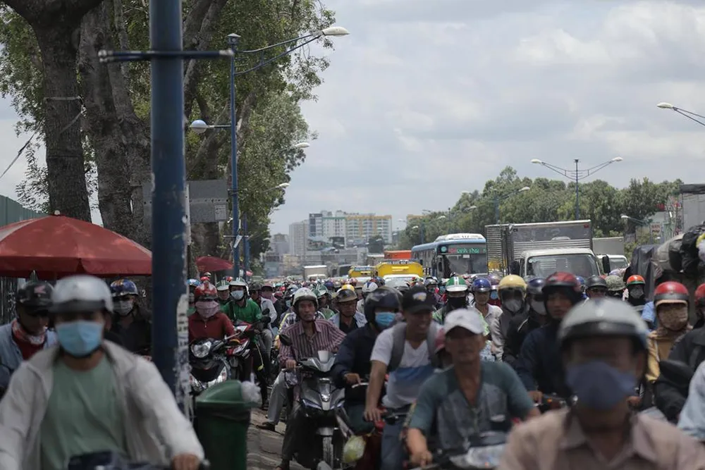 Ảnh hưởng từ vụ tai nạn khiến giao thông qua khu vực ùn ứ nghiêm trọng, hàng ngàn phương tiện xếp hàng dài trên đường giữa trưa nắng.