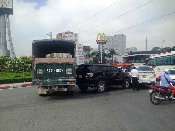 Trong khi hai tài xế đang giải quyết thì chiếc xe tải mang BKS 54Z-9528 cũng đang ôm cua vòng xoay đã đâm vào đuôi xế hộp khiến ba xe dính chùm nhau.