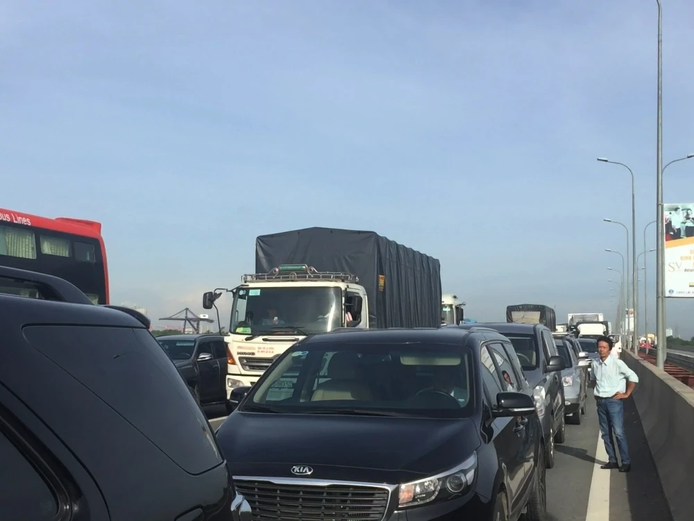 Do hai phương tiện nằm trên cầu, sự việc lại rơi vào giờ cao điểm sáng khiến giao thông trên cao tốc ùn tắc nghiêm trọng.
