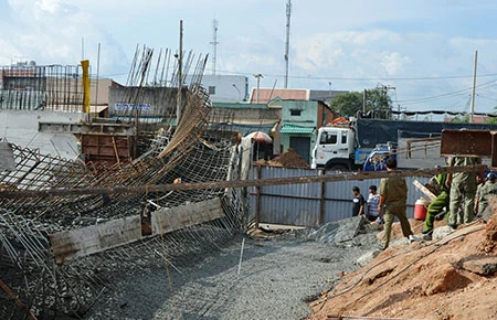 Tại hiện trường, một phần cốt pha công trình rộng khoảng 15 m2 bị đổ sập trơ khung sắt. Lực lượng chức năng phải dùng cần cẩu nâng khung sắt lên đưa thi thể nạn nhân ra ngoài.