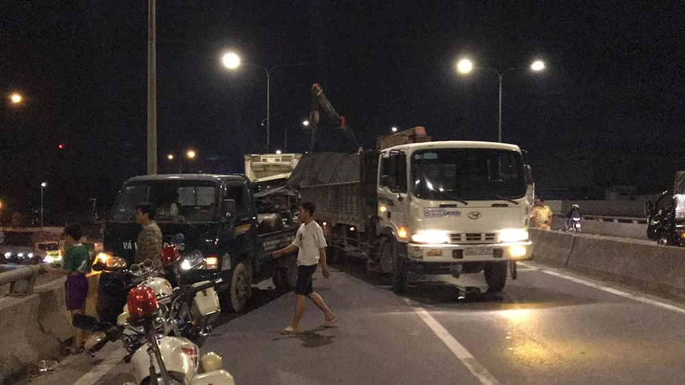 Quan sát tại hiện trường, cabin hai xe tải vỡ nát, bẹp dúm. Hai phương tiện còn lại hư hỏng nhẹ hơn. Cả bốn xe chắn hết một chiều đường trên cầu vượt hướng về Bình Tân khiến giao thông lưu chuyển khó khăn.