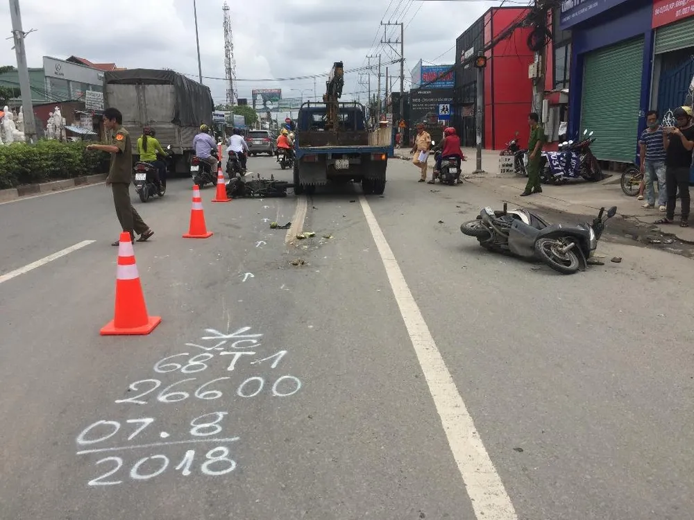 Tại hiện trường hai xe máy nằm cạnh xe tải, riêng chiếc 68T1-266-00 bị kéo lê, hư hỏng nặng.