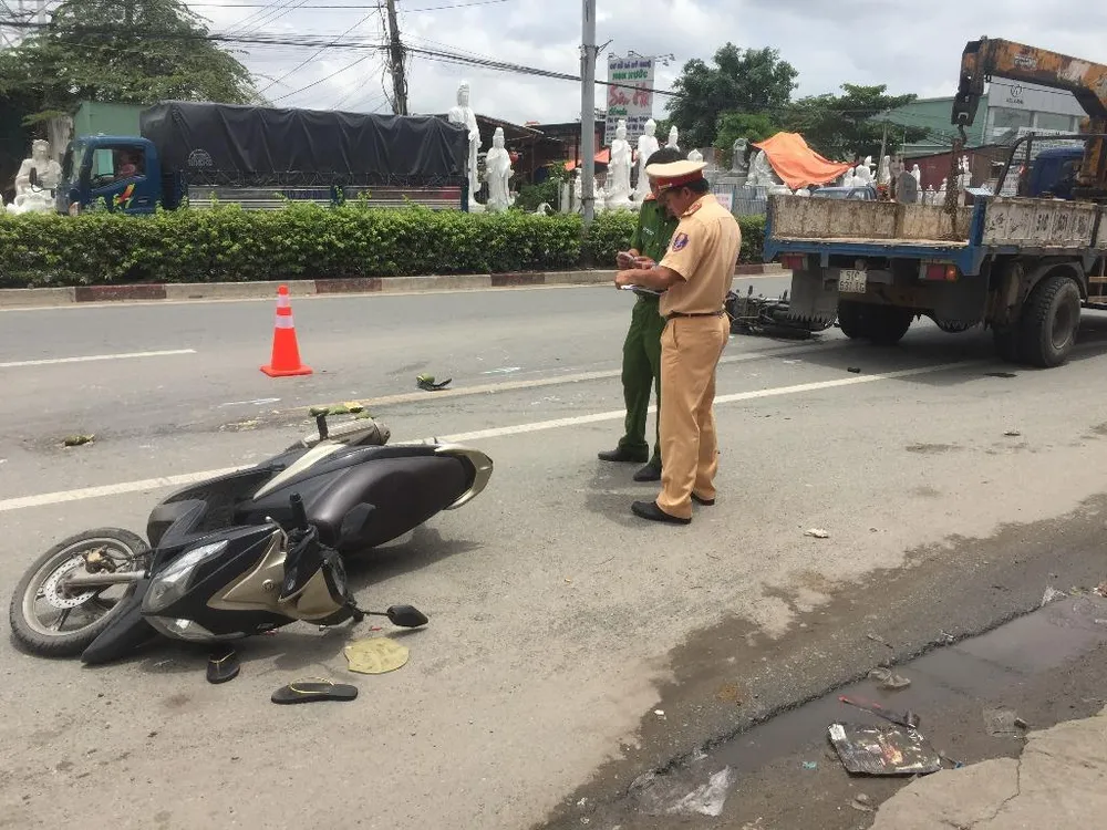 Cùng lúc, xe máy 59X2-978.93 do một phụ nữ lái, do không kịp xử lý đã tông vào xe tải rồi ngã nhào.