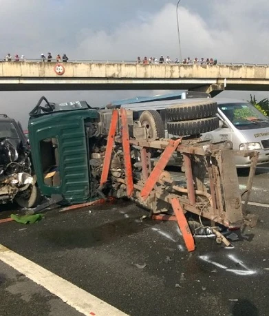Hiện trường vụ tai nạn khi có thêm ba chiếc xe tông vào xe tải lúc này đang nằm ngang giữa đường.