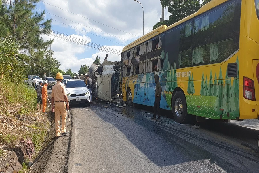 Xe đầu kéo tiếp tục trượt dài xề phía trước lao vào xe khách do tài xế NTT (45 tuổi, ngụ tại TP Thủ Đức, TP.HCM) điều khiển đang lên đèo Bảo Lộc phía sau xe tải đông lạnh.