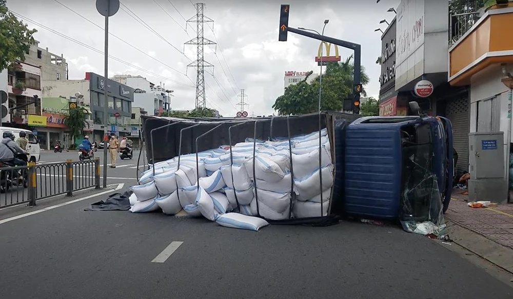 Xe tải chở gạo lật ngang chắn một làn đường.