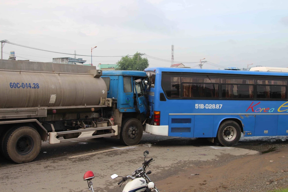 Cú va chạm đã khiến hai thanh niên văng ra xa, bị thương. Xe khách vì thắng gấp nên đã bị xe bồn phía sau đâm thẳng vào đuôi. Lúc này, xe ben chạy sau thắng không kịp nên cũng đâm thẳng vào đuôi xe bồn.