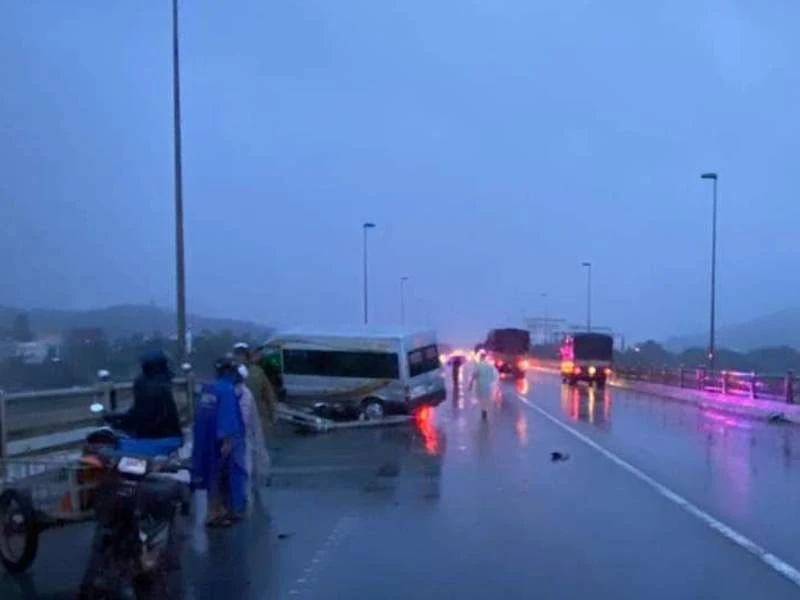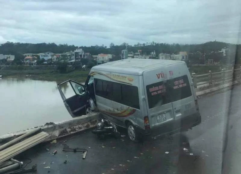 Tiếp đến, chiếc xe khách 63B-007.93 (chưa rõ người điều khiển) chạy theo hướng Bắc – Nam va vào một xe máy khác, sau đó tông gãy lan can cầu, hai bánh trước nằm ngoài lan can suýt rơi xuống sông.