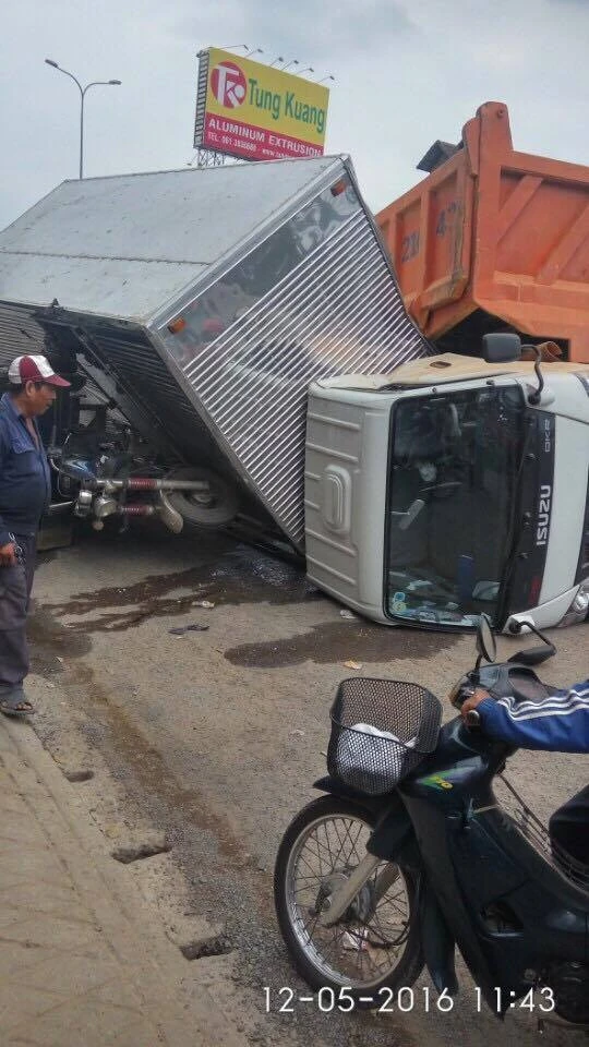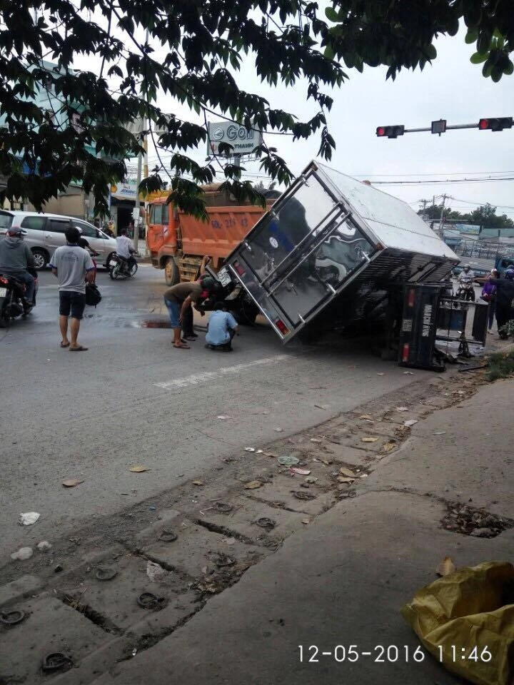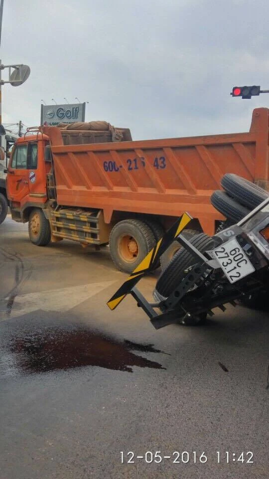 Chưa dừng lại, xe ben này theo đà tông tiếp vào xe tải (biển số 60C-273.12) đang lưu thông trên đường, khiến xe tải ngã đè lên xe chở hàng bên cạnh.