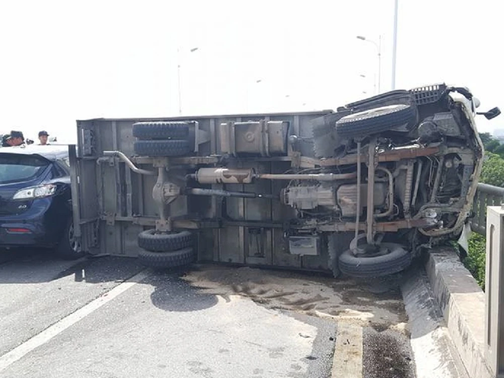 Vụ tai nạn trên cầu Vĩnh Tuy khiến chiếc xe tải bị lật ngang.