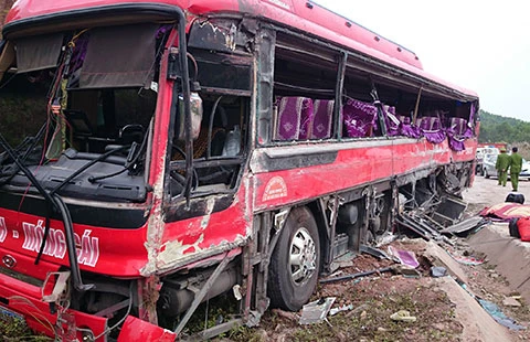 Chiếc xe khách hư hại nặng sau vụ tai nạn. Ảnh: TTXVN
