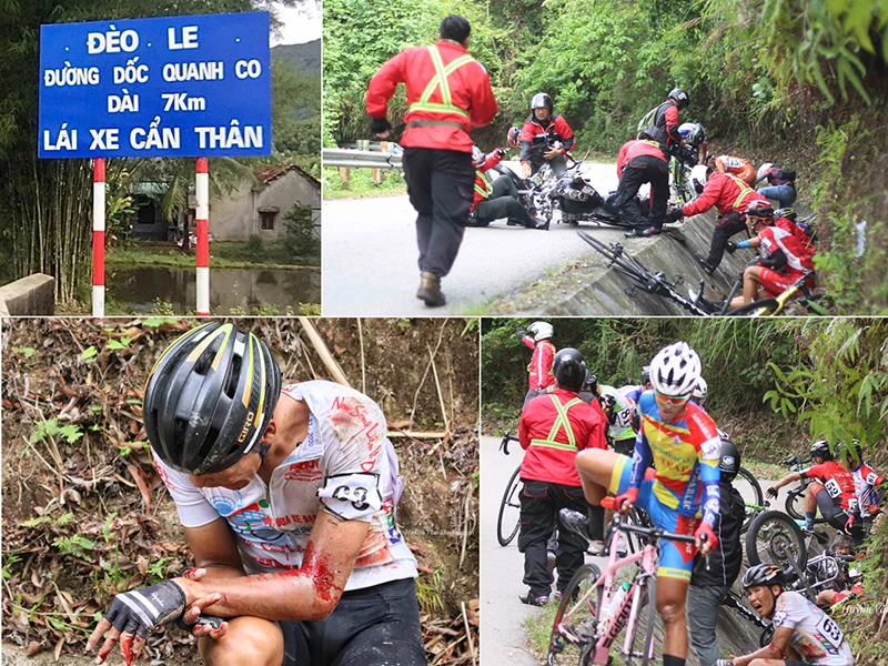 Tai nạn xảy ra khi các tay đua qua đỉnh đèo và đổ dốc với tốc độ cao. Hơn 10 VĐV và một nhà báo chạy mô tô theo đoàn đua đã bị ngã. Một số tay đua sau khi được trợ giúp đã cố gắng quay trở lại đường đua với chân tay rướm máu. Số còn lại, trong đó có tay đua đang giữ áo trắng (VĐV trẻ xuất sắc nhất) Võ Thanh An đã phải lên xe cứu thương vì bị gãy ngón tay. Cùng số phận với Thanh An, những VĐV không thể thi đấu tiếp chặng 6 có Nguyễn Minh Thiện, Phan Thanh Tấn Tài, Nguyễn Huỳnh Ngọc Long… bị chấn thương vùng ngực và cổ tay, cổ chân, không thể thi đấu.