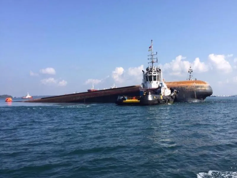 Tàu nạo vét JBB De Rong 19 lật úp và chìm một nửa được hai tàu của Cơ quan hàng hải và cảng vụ Singapore (MPA) lai dắt. Ảnh: STRAITS TIMES