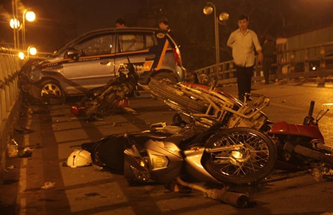 Trước đó, khoảng 22 giờ 40 ngày 8-11, tại cầu vượt Chùa Bộc - Thái Hà (Hà Nội), một xe taxi đã tông hàng loạt xe máy khiến hàng chục người phải nhập viện, nhiều phương tiện hư hỏng nặng.