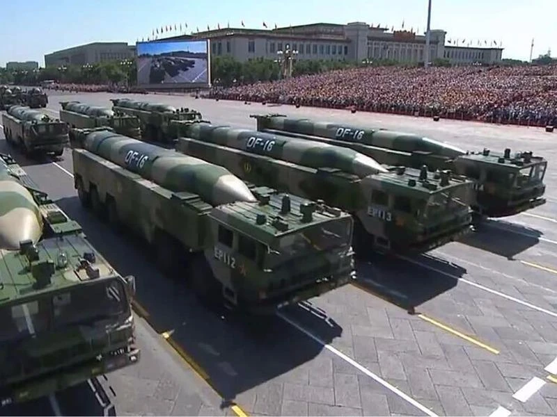 Các xe quân sự chở tên lửa Đông Phong 16 trong một cuộc diễu binh ở quảng trường Thiên An Môn ở Bắc Kinh. Ảnh: HANDOUT