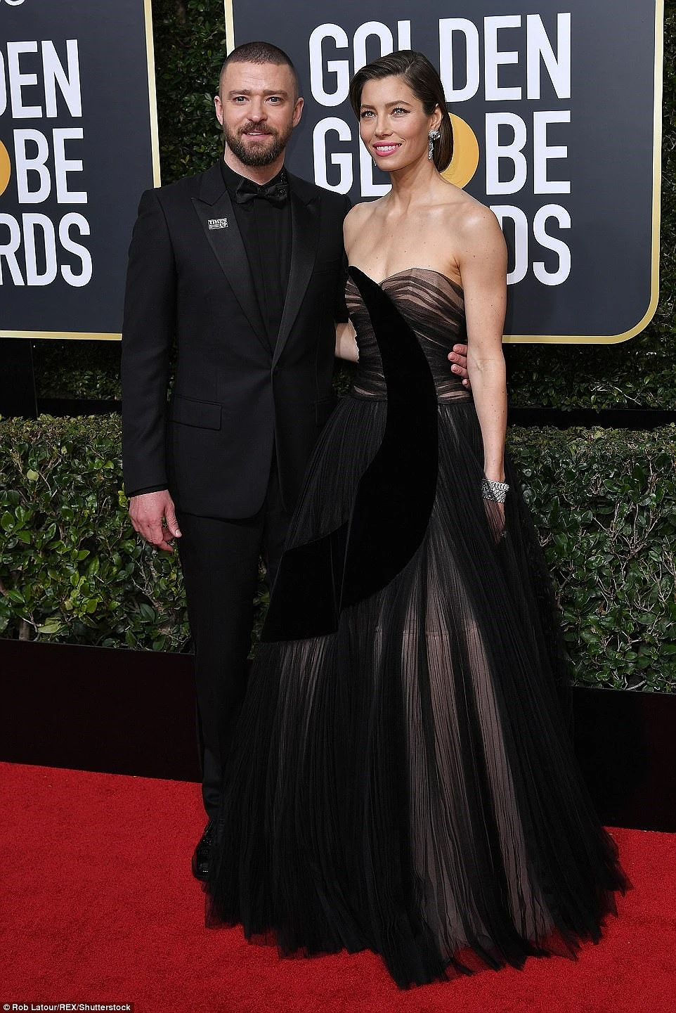 Không chỉ các sao nữ mới tham gia hưởng ứng phong trào Time's Up, mà các sao nam hầu như cũng diện đồ đen như các quý cô. Trong hình, Justin Timberlake cùng vợ Jessica Biel diện đồ đen tham dự sự kiện. Ảnh: Shutter Stock.