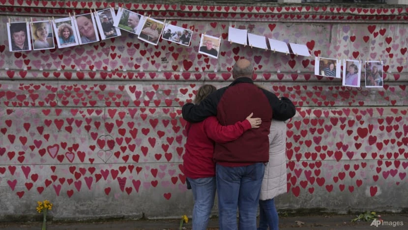 Một gia đình ôm nhau khi đứng trước bức tường tưởng niệm những nạn nhân qua đời vì COVID-19 ở London (Anh) ngày 29-3. Ảnh: AP