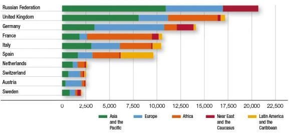 Các dữ liệu 2014 từ Quỹ quốc tế về phát triển nông nghiệp khiến mọi người ngạc nhiên. Đầu tiên, Nga đứng cao nhất, với 20,7 tỉ đôla tiền gửi, mặc dù GDP tính theo đầu sản phẩm nội địa của nó thì ít hơn so với các quốc gia khác. Vương quốc Anh, nước ghi nhận có 17,1 tỉ đôla tiền gửi, có GDP bình quân đầu người là cao hơn Nga gần 50 %. Điều ngạc nhiên thứ hai là khủng hoảng kinh tế năm ngoái đã không ảnh hưởng đến sự dẫn dầu của Nga.