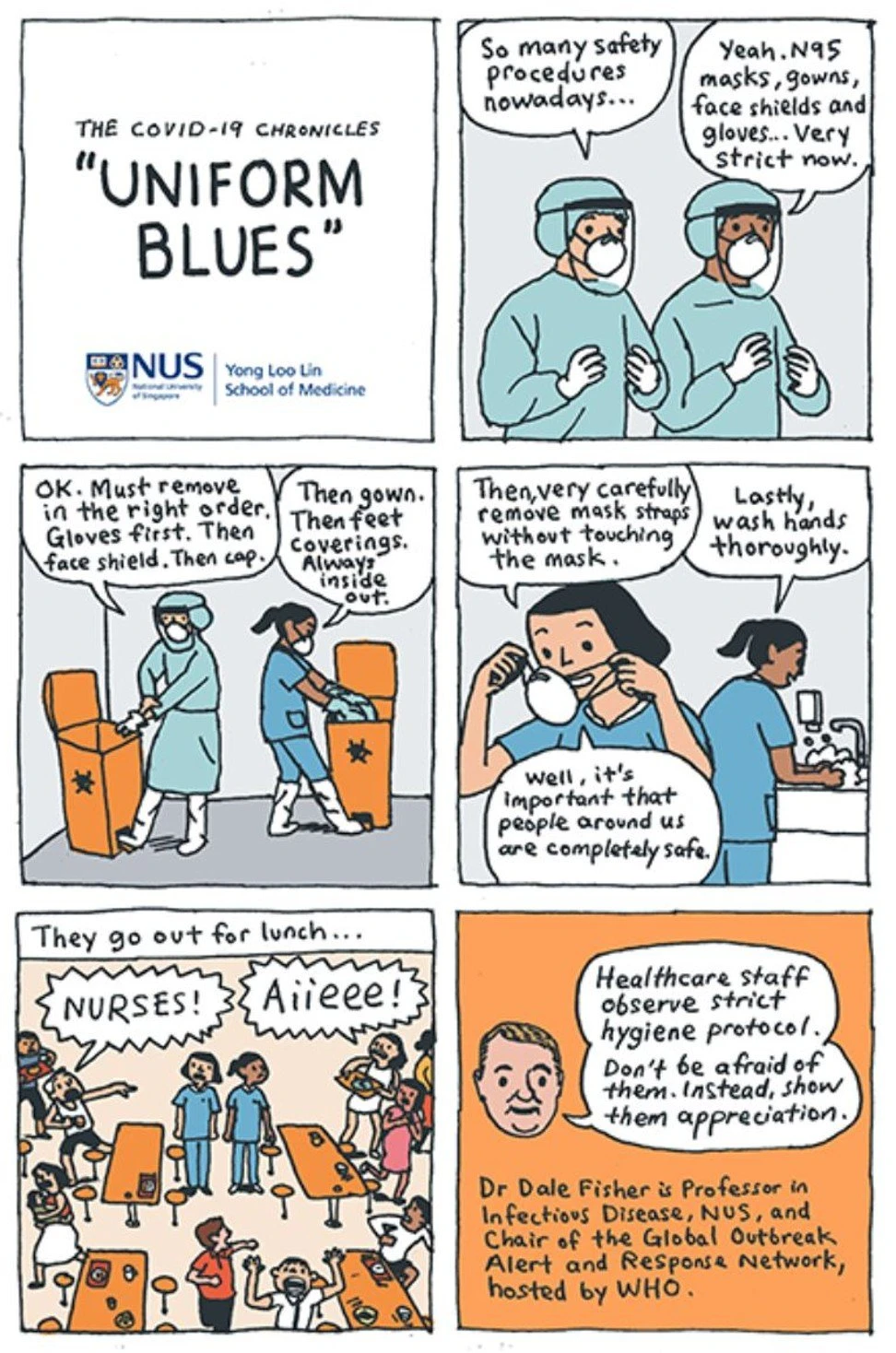 Một tranh tuyên truyền về trình tự lột bỏ đồ bảo hộ dành cho nhân viên y tế Singapore. Ảnh: SCMP