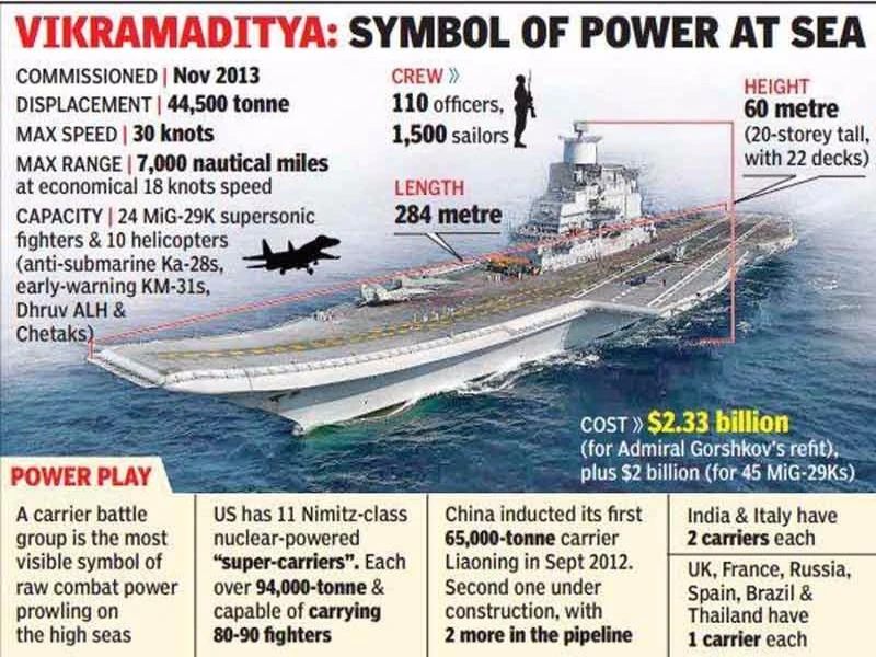 Về phần mình, Hải quân Ấn Độ hiện thực hiện chiến lược chú trọng hơn vào các nhóm tác chiến tàu sân bay. Quan điểm được đưa ra có nội dung rằng Ấn Độ phải thống trị khu vực Ấn Độ Dương và nước này cần sở hữu các tàu sân bay thì mới có thể tăng cường năng lực xa bờ. Tuy nhiên, New Delhi đã phí quá nhiều thời gian và tiền bạc cho tàu sân bay Đô đốc Gorshkov mua lại từ Nga. Kế hoạch đưa con tàu tới Ấn Độ đã trễ sáu năm và gấp ba lần chi phí so với các hứa hẹn được đưa ra trước đó.