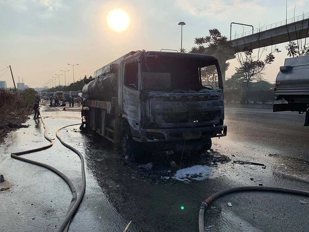 Đám cháy bùng phát từ chiếc xe bồn chở xăng dầu trên xa lộ Hà Nội. Ảnh HT.