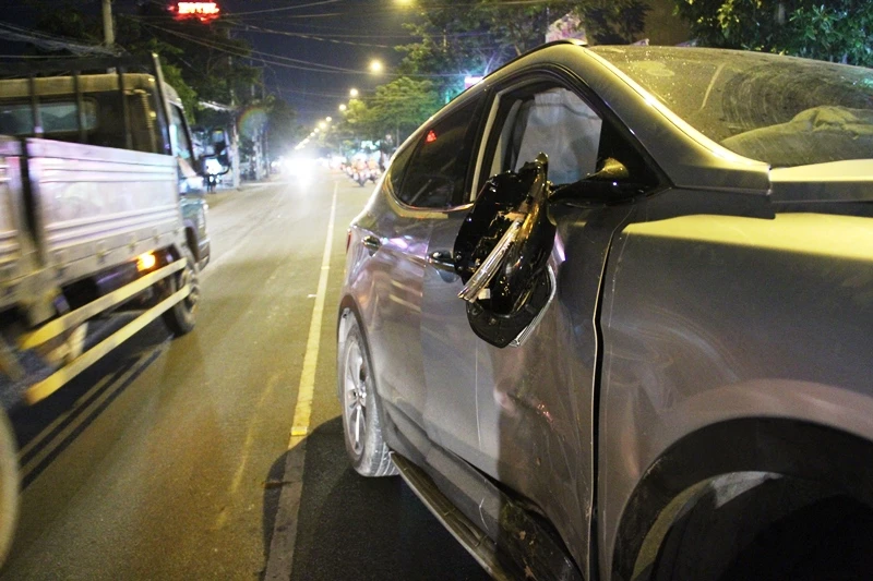 Phần thân xe bị móp méo, kính chiếu hậu vỡ sau khi lao vào gốc cây (ảnh Nguyễn Tân)
