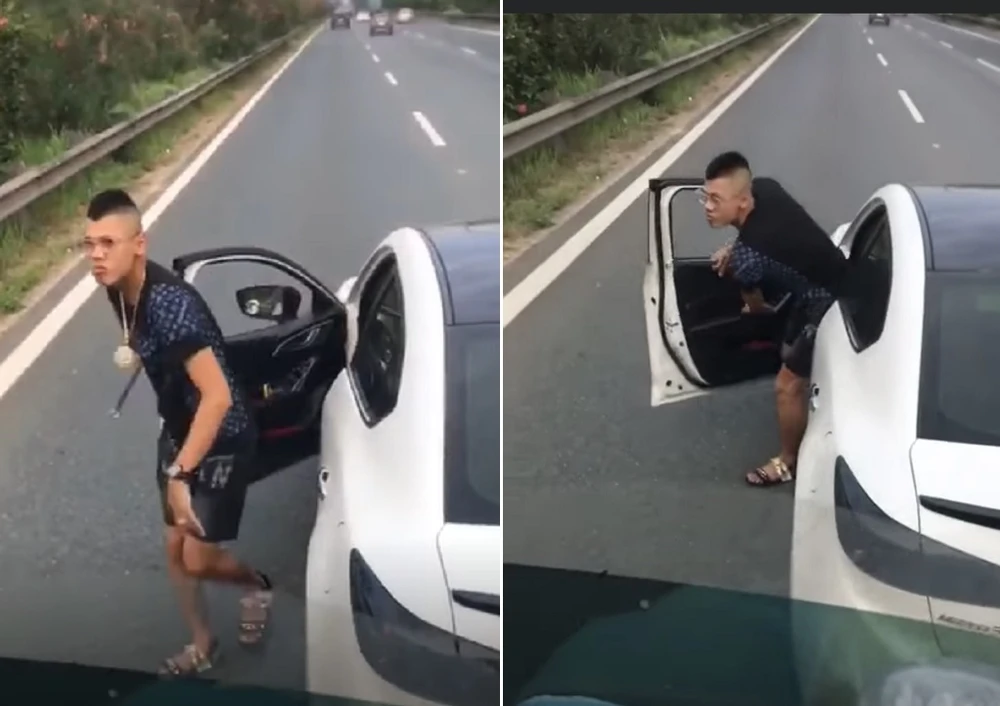 Đáng nói, tài xế xe con liên tục lạng lách, chặn đầu, tỏ vẻ thách thức đối với xe tải đi phía sau. Thậm chí, tài xế xe con còn ngang nhiên dừng xe giữa đường, mở cửa xe, cầm hung khí xuống gây sự.