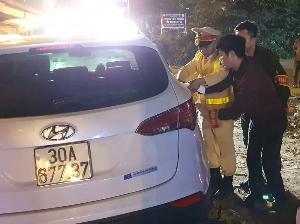 Theo đó, khoảng 22 giờ 40 đêm 3-1, khi đang làm nhiệm vụ tại tuyến đường Nghiêm Xuân Yên, tổ công tác phát hiện chiếc ô tô hiệu Hyundai Santafe mang BKS 30A-677.37 chạy với tốc độ cao, có nhiều biểu hiện nghi vấn.