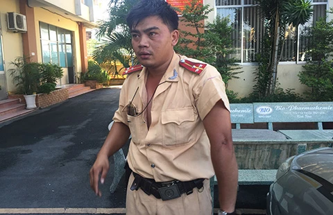 “Thấy vậy, tôi lập tức dùng mô tô đặc chủng đuổi theo. Chạy hơn 300 m, đến cầu vượt bộ hành trước cổng Khu du lịch Suối Tiên thì tôi đuổi kịp và chặn dừng xe tải này. Tài xế lại cho lùi xe để né và định tiếp tục bỏ chạy thì tôi nhảy lên cửa xe yêu cầu chấp hành. Người này vẫn cố tình tăng ga và đánh lái lạng lách, đánh võng và còn dùng tay đánh vào người và giật cầu vai của tôi” - Thượng úy Thoại kể.