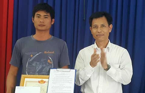 Tài xế xe tải Phan Văn Bắc (trái) tại lễ nhận bằng khen tại trụ sở xã Đạ Oai, huyện Đạ Huoai, Lâm Đồng Ảnh: T.DŨNG