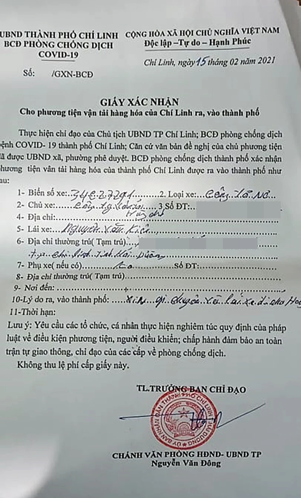 Đáng chú ý là quá trình làm việc, ông Kiên xuất trình một giấy xác nhận với nội dung cho phương tiện vận tải hàng hóa của Chí Linh ra vào thành phố. Giấy này do ông Nguyễn Văn Đông, Chánh Văn phòng HĐND và UBND TP Chí Linh, tỉnh Hải Dương ký tên đóng dấu ngày 15-2.