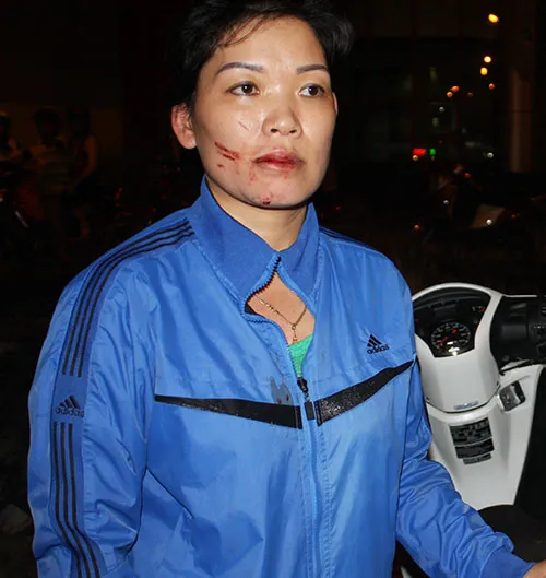Tại cơ quan công an, chị Nhân bị xưng vùng mặt, miệng tím bầm chảy máu. Chị luôn cảm thấy bị đầu, đau vùng bụng do tài xế Tình hành hung.