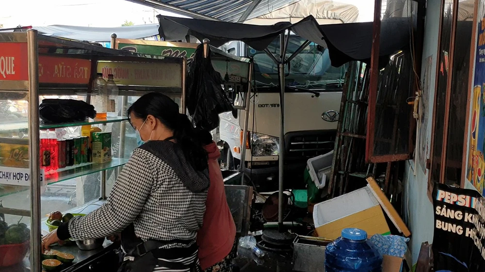 Chiếc xe tải bị tông lao vào tiệm nước mía trên vỉa hè. Ảnh: NT