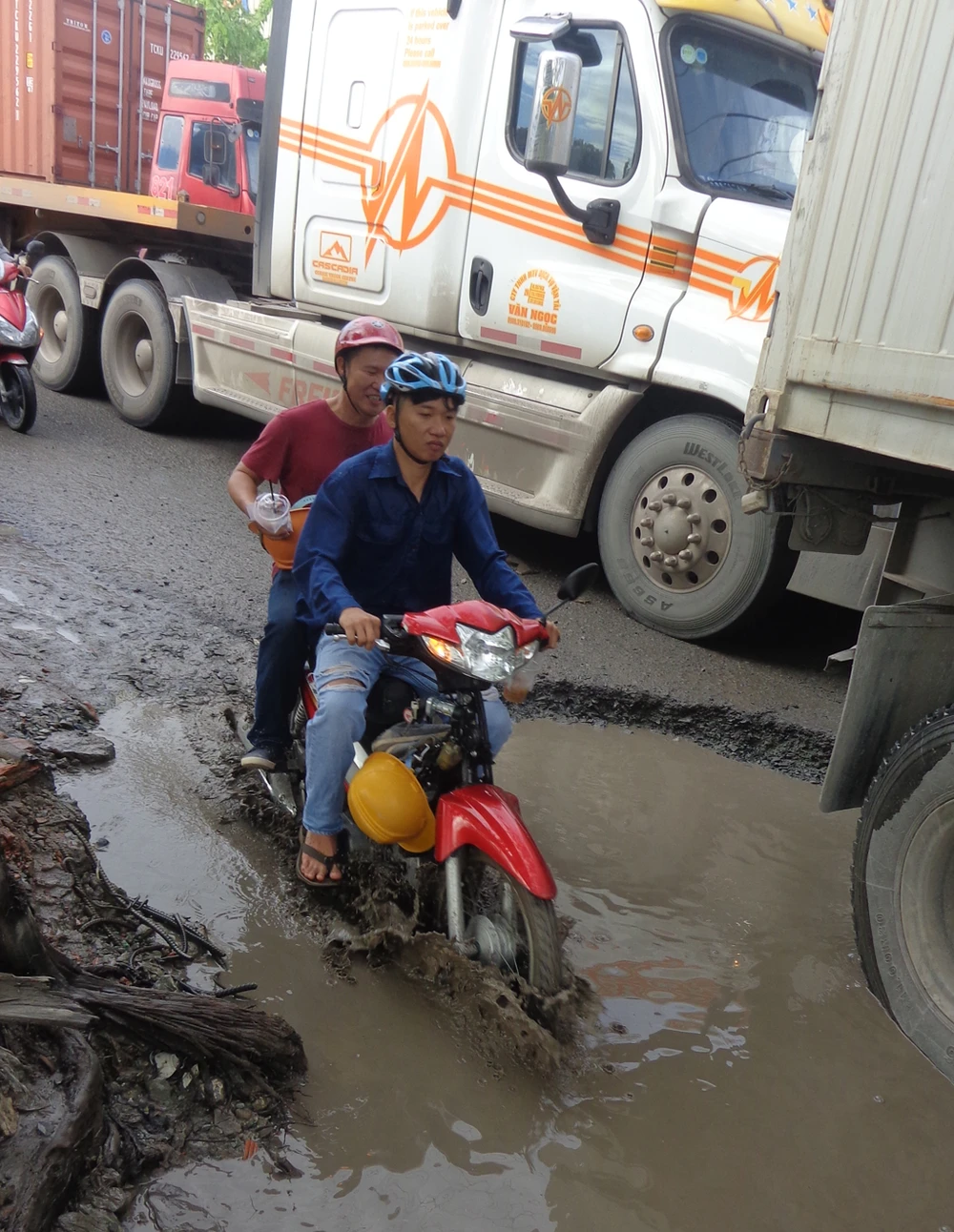 Xe máy thoát khỏi đầu-đuôi xe container gặp ngay các hố sình nhưng cũng đành chấp nhận vục đầu bánh trước xuống để vượt qua, quá nguy hiểm khi hố phía trước lởm chởm đá, đất và bánh xe tải thì kế bên.