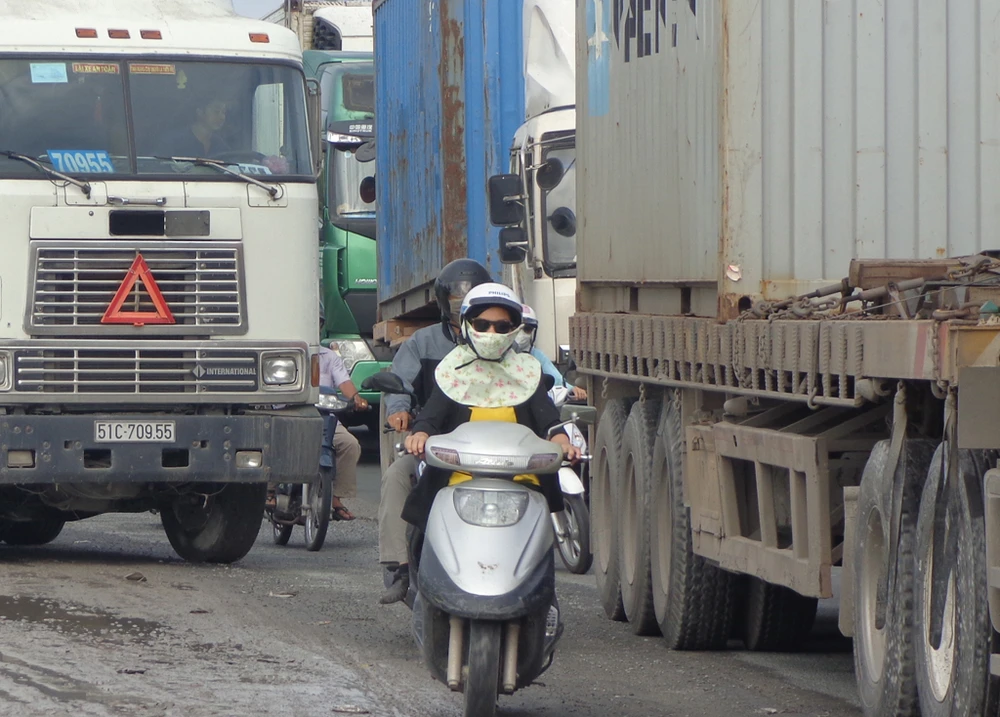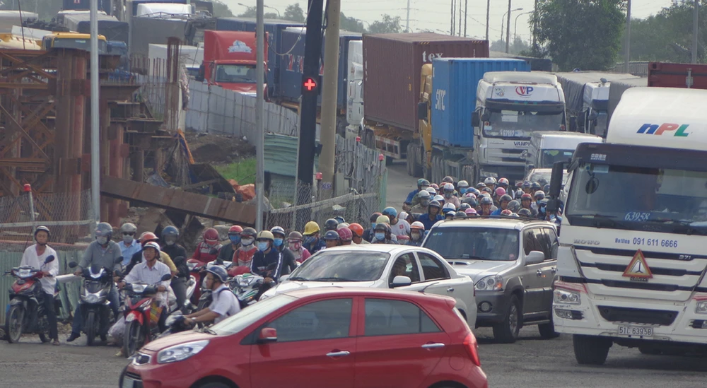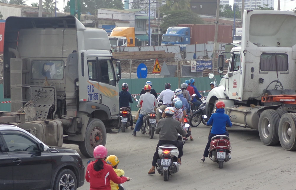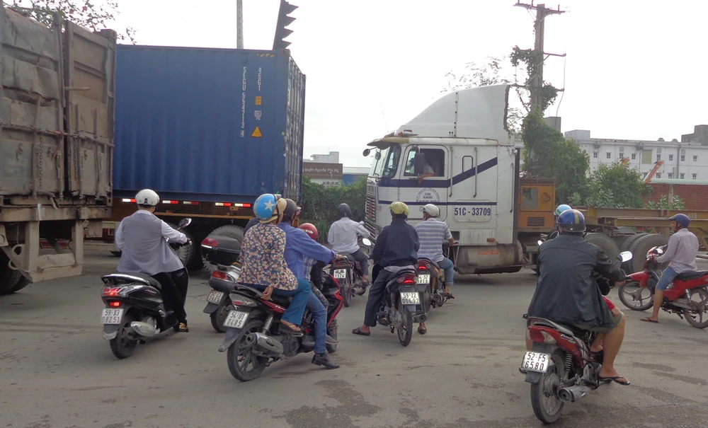 Dòng xe máy phải đi bọc sang đường vào Khu công nghiệp Cát Lái rồi đi luồn giữa đầu và đuôi các xe container để thoát đi, bất chấp nguy hiểm, tai nạn rình rập.