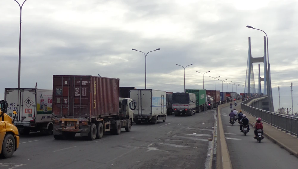 Dòng xe kẹt nối dài lên đến giữa cầu Phú Mỹ.