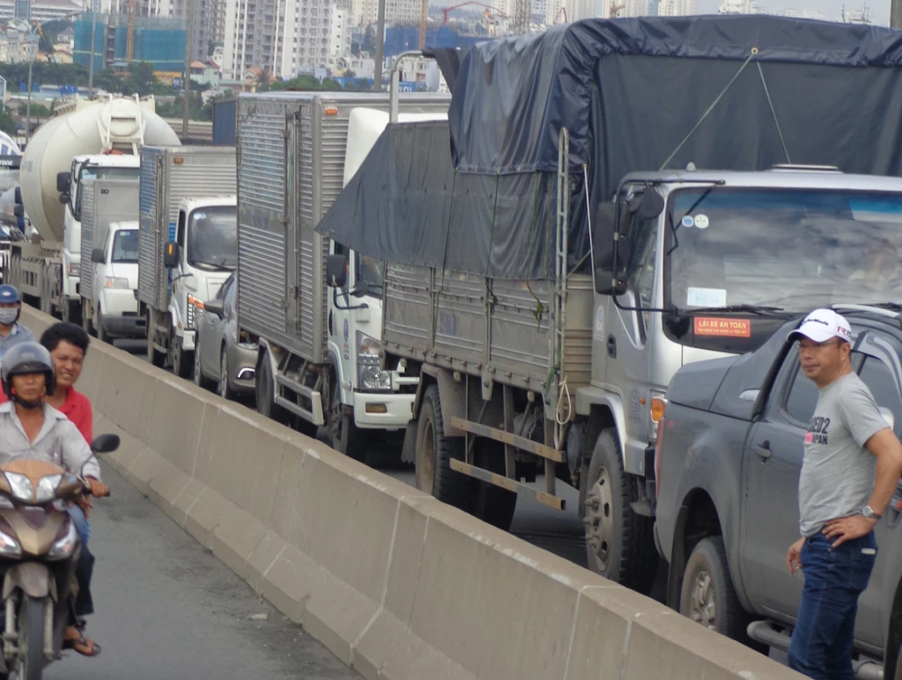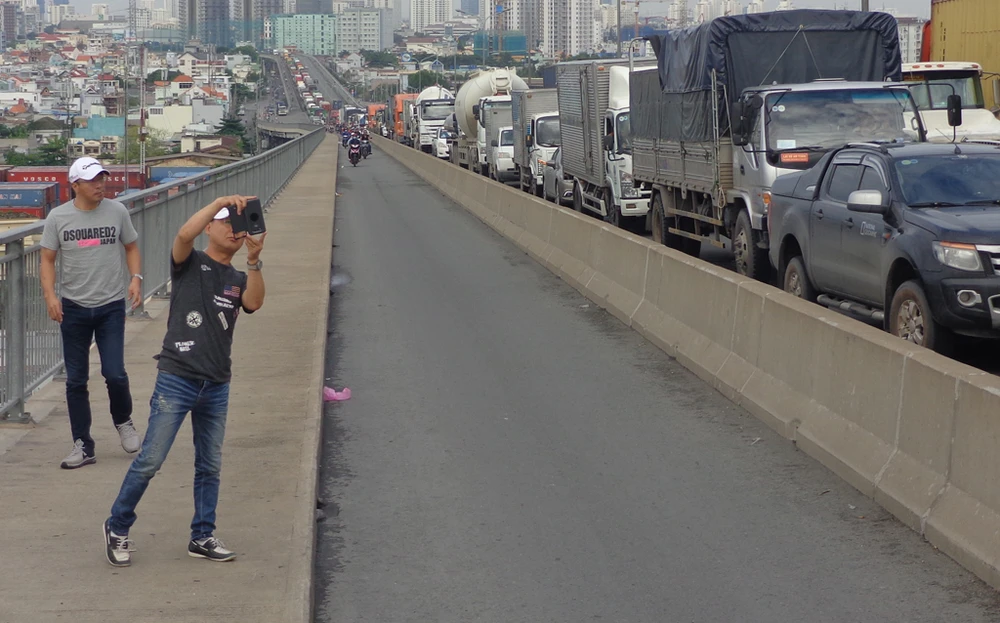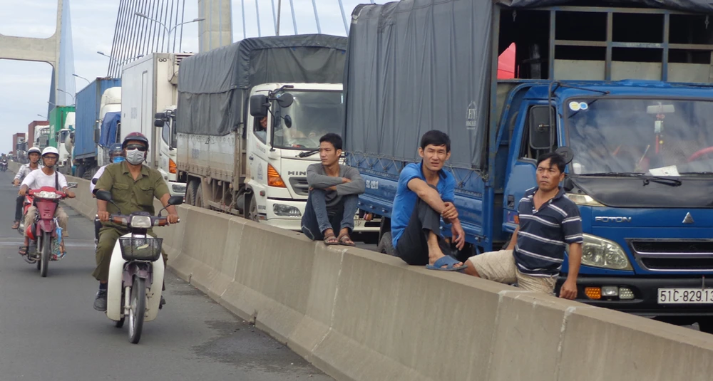 Phía dưới dốc cầu đổ sang quận 2, nhiều lái xe tải chờ quá lâu cũng chỉ còn cách bước xuống xe, ngồi khoanh tay bó gối trên dải phân cách và... chờ. Tài xế Nguyễn Văn Hùng lái xe chở cá từ chợ đầu mối Bình Điền cho biết quãng đường chưa tới 8 km từ chợ Bình Điền đến cầu Phú Mỹ đi cà nhích từ 2 giờ rưỡi đêm trước mà tới hơn 8 giờ sáng nay mà vẫn chưa thoát được.