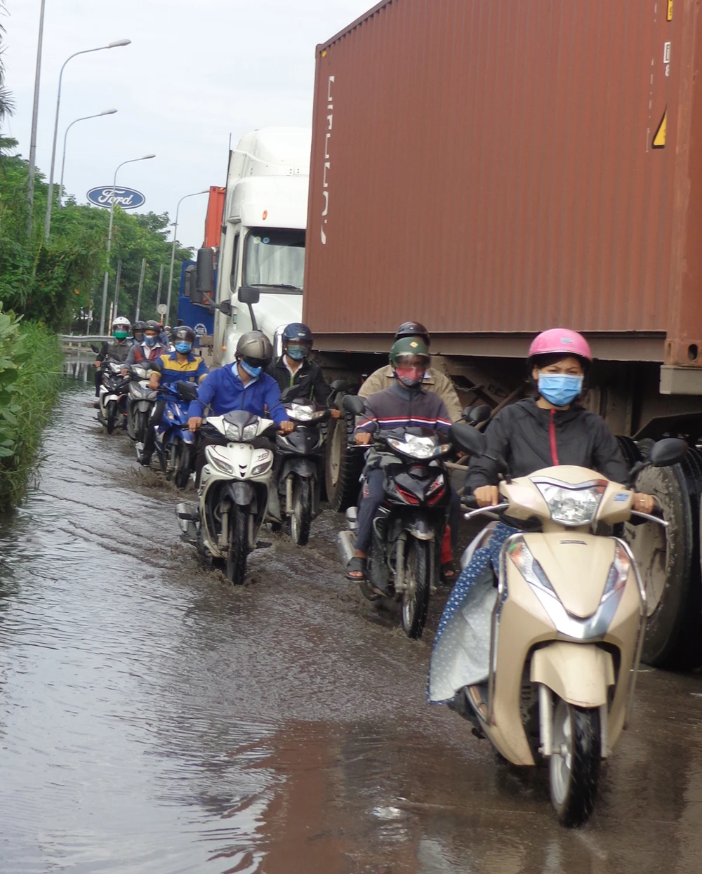 Tại trạm thu phí cầu Phú Mỹ, dòng xe tải đông đặc lấn ép người đi xe máy dạt ra các vũng nước bên ngoài.