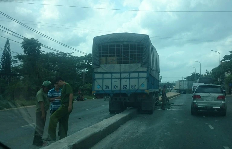 Bước đầu cơ quan chức năng xác định xe tải 34K 8262 chạy hướng Phan Thiết-TPHCM do lái xe ngủ gục xử lý kém đã leo lên dải phân cách.