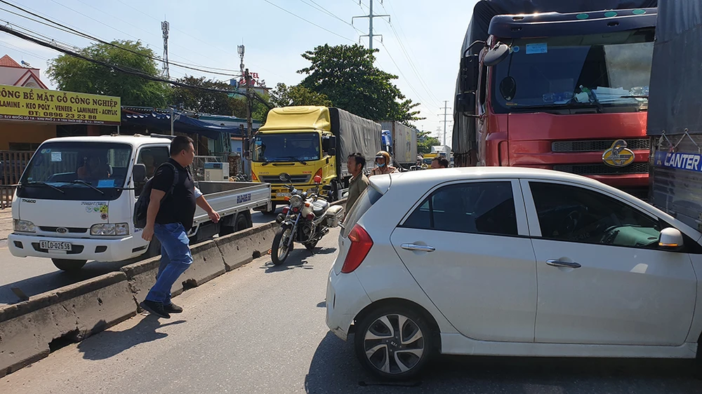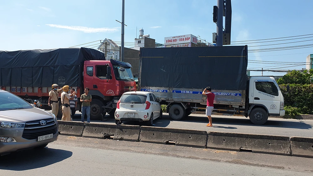 Vụ tai nạn liên hoàn giữa ba phương tiện trên Quốc lộ 1A đoạn qua quận 12 trưa 3-6. Ảnh: NT