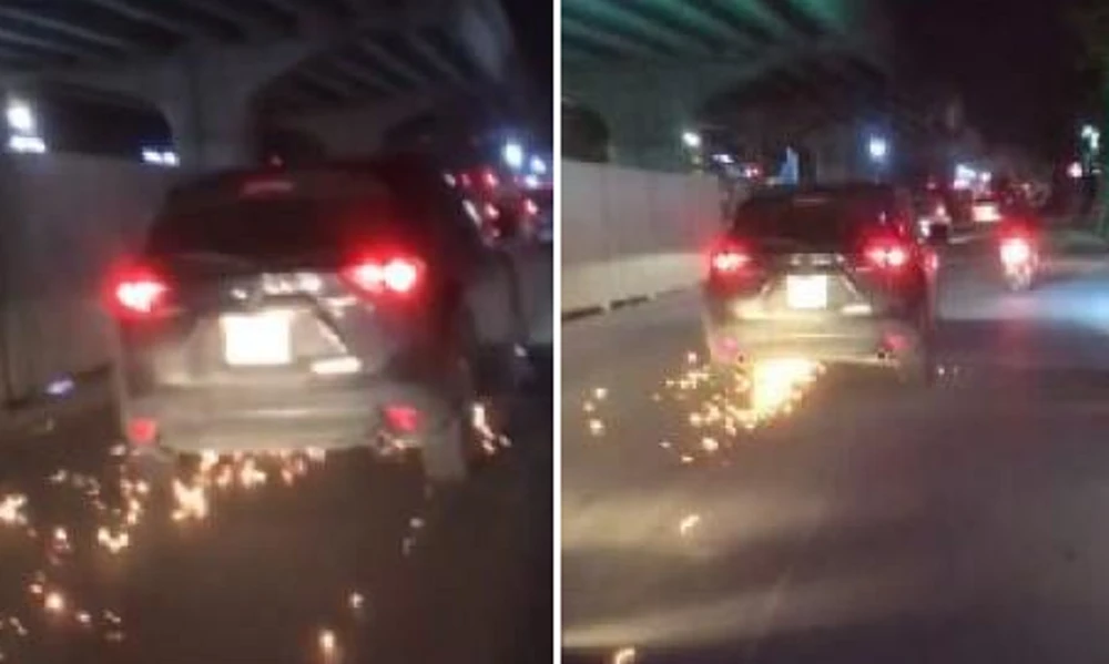Tuy nhiên, tài xế ô tô không dừng lại mà tiếp tục phóng xe bỏ chạy, kéo lê chiếc xe đạp điện mắc kẹt dưới gầm làm mặt đường tóe lửa.