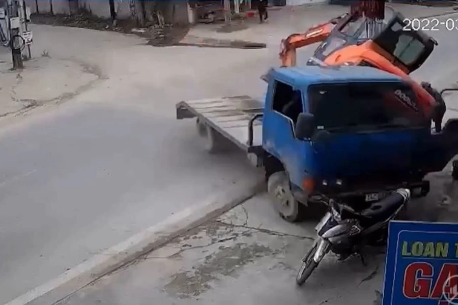 Chiếc xe tải tiếp tục lao lên vỉa hè và máy múc trên thùng xe tải trúc xuống đè trúng nạn nhân. Ảnh cắt từ video clip.