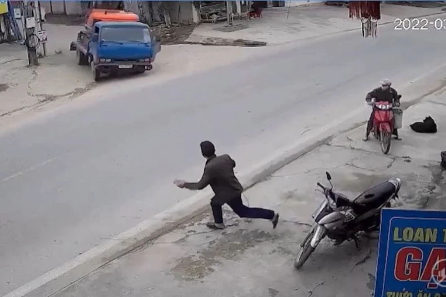 Một người dân phát hiện xe tải "không người lái" đang lao tới đã kịp tháo chạy. Ảnh cắt từ video clip.