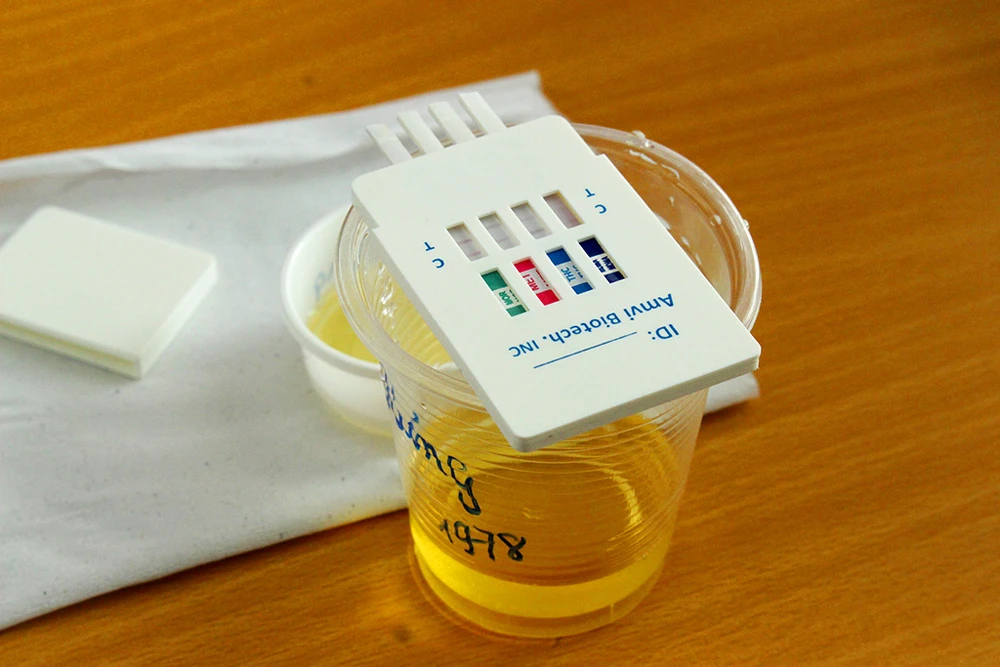 Sau khi có mẫu nước tiểu nhân viên y tế sẽ dùng que thử có giấy quỳ để kiểm tra, năm phút sẽ cho kết quả.